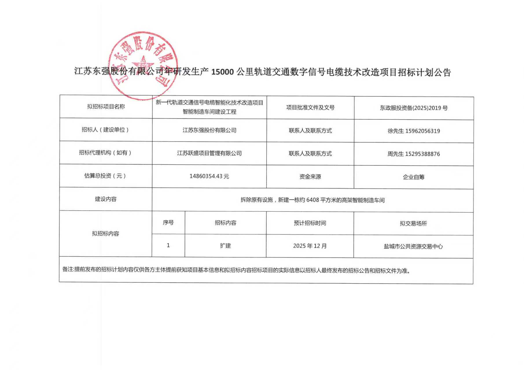 江苏东强股份有限公司年研发生产15000公里轨道交通数字信号电缆技术改造项目招标计划公告
