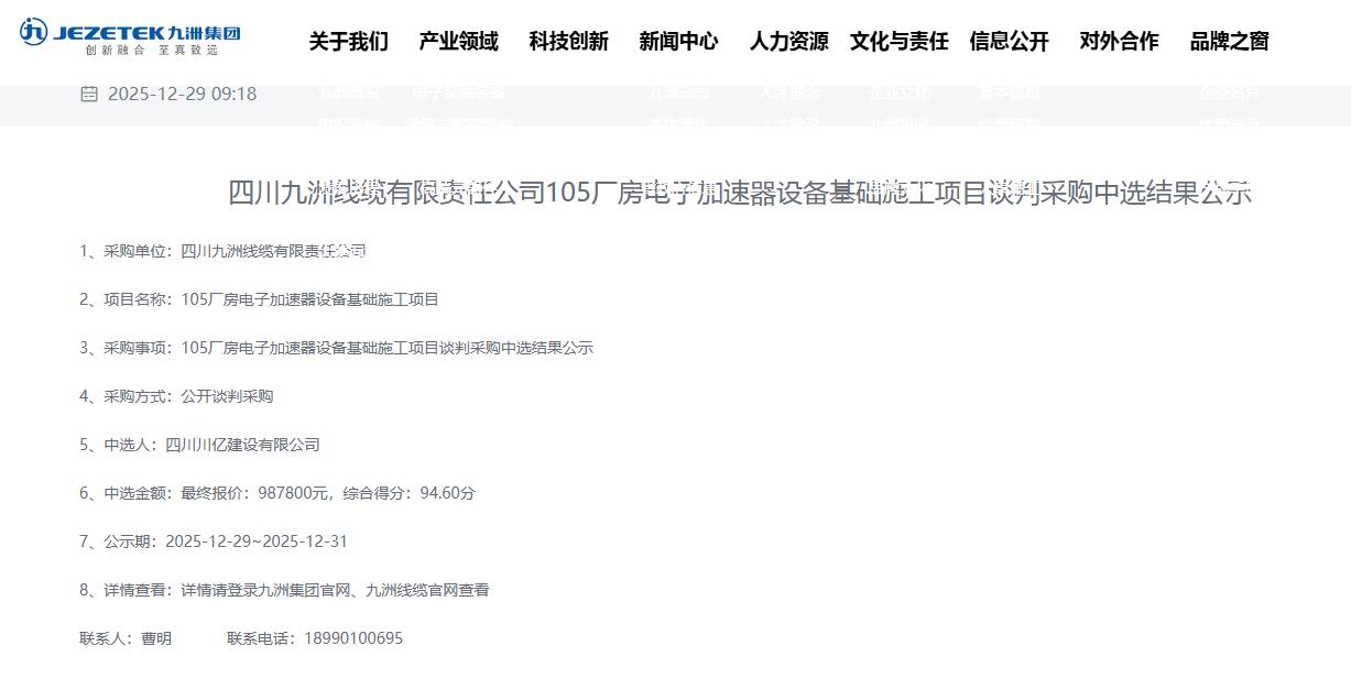 105厂房电子加速器设备基础施工项目谈判采购中选结果公示