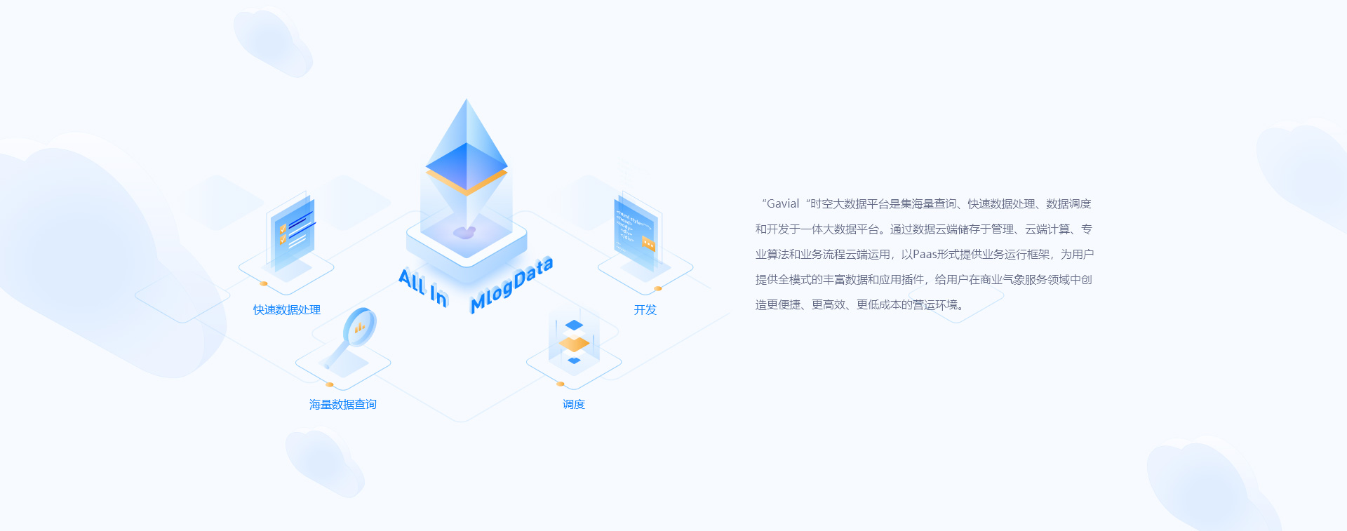 通过“1+3”产品套件,Gavial大数据主平台+Gavial-Stone容器平台+GavialML算法平台+Gavial-Falcon高速数据库,一站式满足时空数据领域的各类需求,适用于气象,环保,水利,电力等行业95%以上的业务场景。
